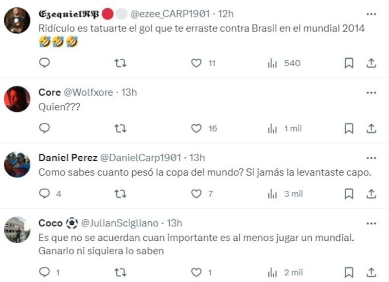 El posteo, era que no, fue comentada por cientos de hinchas argentinos, que no olvidan que el exdelantero alguna vez se tatuó su recordó tiró en el travesaño jugando por La Roja ante Brasil en el Mundial 2014.