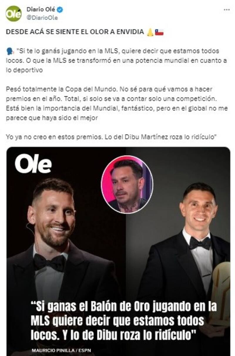 El diario trasandino se lanzó con todo contra el exfutbolista chileno, replicando sus declaraciones con un directo llamado en sus redes sociales oficiales: “Desde acá se siente el olor a envidia”, con el emoji de una nariz y una bandera chilena. La publicación obviamente acompañada por la imagen de Messi y el Dibu con sus Balones de Oro.
