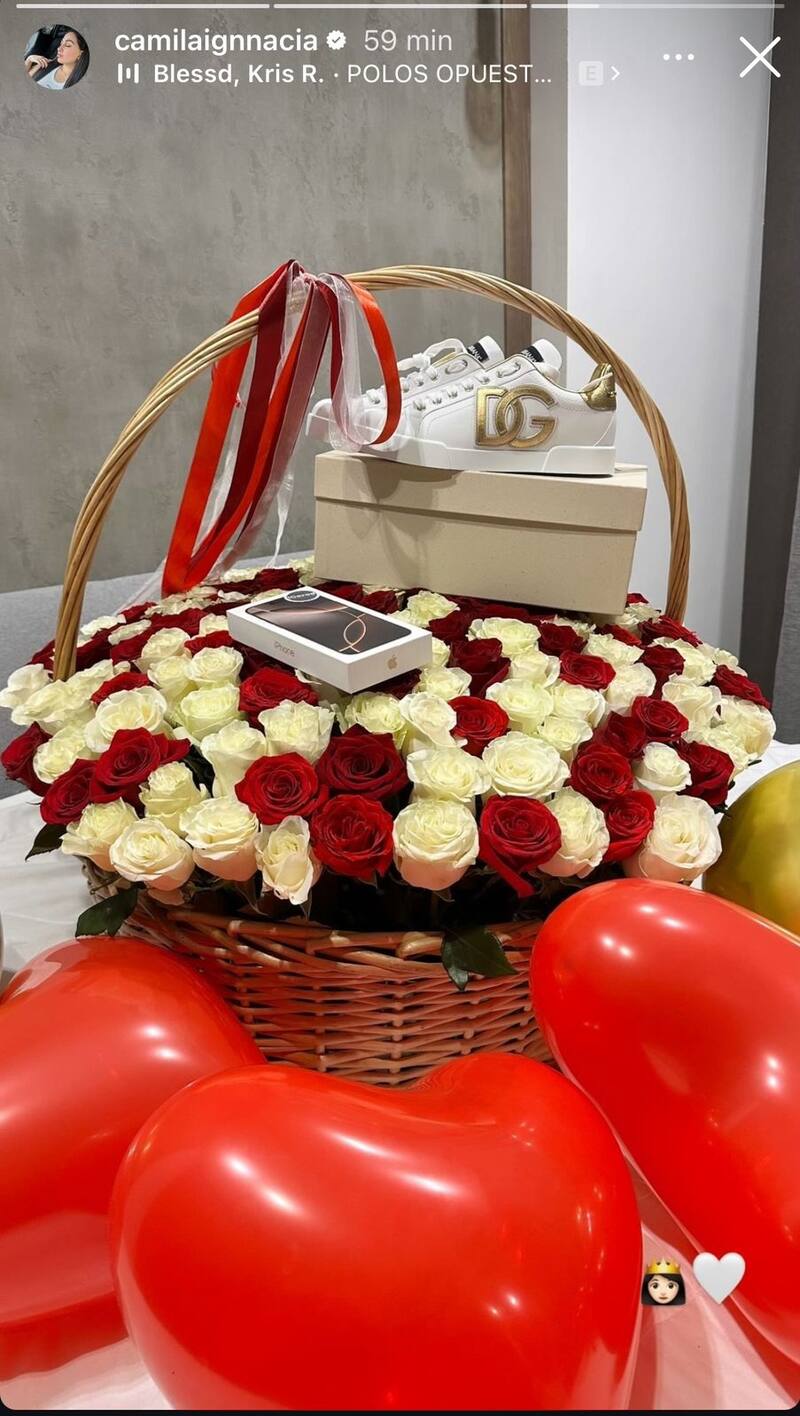 En la imagen se puede apreciar un canasto lleno de rosas blancas y rojas, las que están acompañadas de un Iphone 16, que está avaluado en un millón de pesos chilenos. Además, unas zapatillas Dolce y Gabbana, específicamente del modelo Portofino que tiene un valor de 959 mil de la divisa chilena.