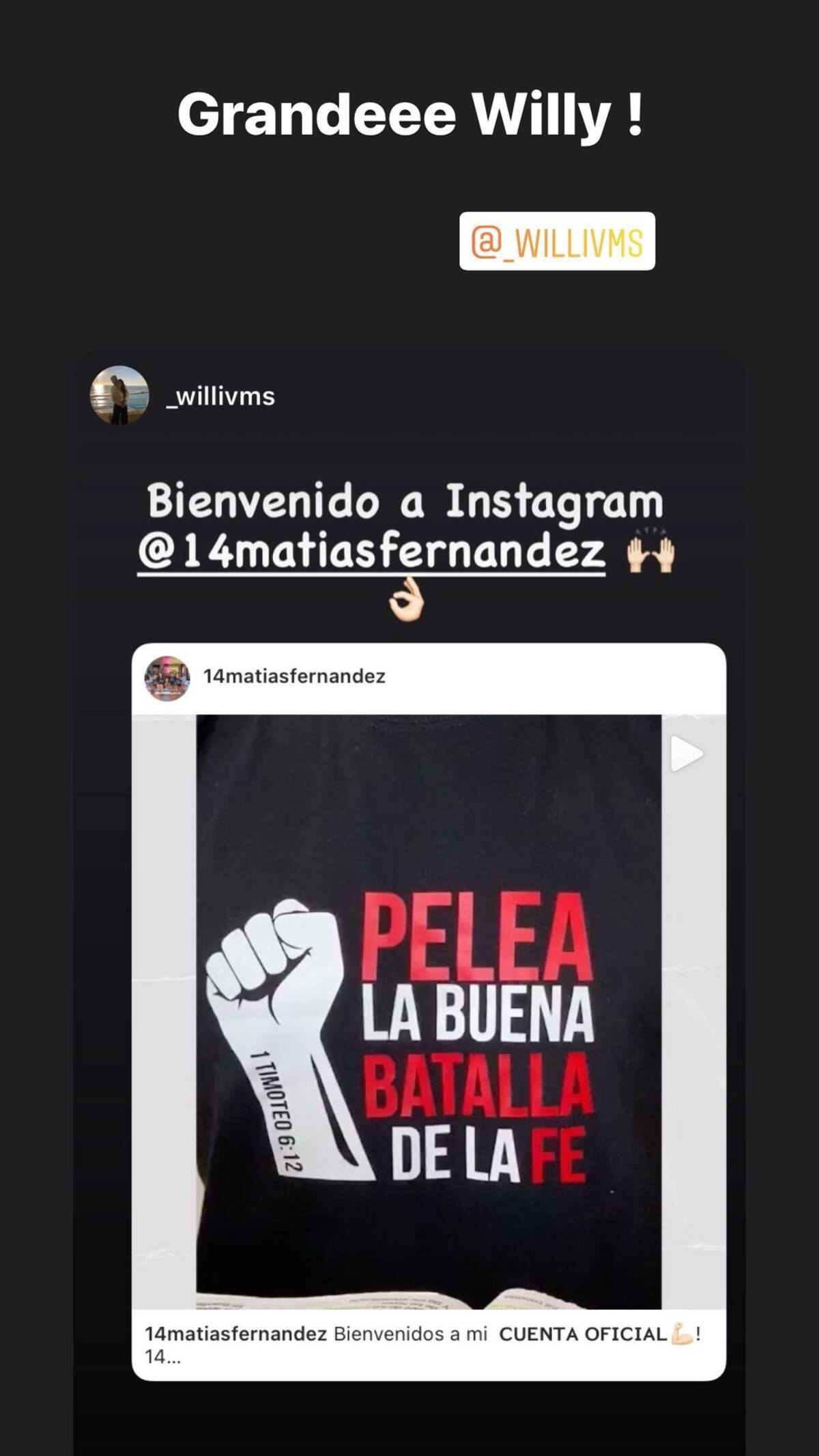 Al fin llegó a Instagram. A través de un video, Matías Fernández presentó su cuenta oficial en la red social, donde se le ve respondiendo 14 preguntas (en referencia al número de su camiseta), que se hacen los "amigos de sus hijas". Con Biblia en mano, el jugador albo responde a muchas dudas y deja en claro que esta es su cuenta oficial (@14matiasfernandez), donde algunos compañeros de profesión ya le han dado una cálida bienvenida. Arturo Vidal ya lo recomendó en una de sus historias, a quien el '14' de Colo Colo le agradeció en el mismo medio. También lo hizo su compañero Williams Alarcón.