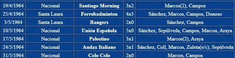En el campeonato siguiente (1964), el Ballet Azul partió con todo y obtuvo otras ocho victorias en forma consecutiva: Santiago Morning (3-2), Ferrobádminton (4-3), Rangers (2-0), Unión Española (5-0, Palestino (3-1), Audax Italiano (5-1) y Colo Colo (2-0). Nada mejor que una victoria ante el archirrival para llegar a ese récord de los 16 partidos ganados de manera consecutiva, porque en la fecha siguiente Universidad de Chile empató sin goles con Magallanes.