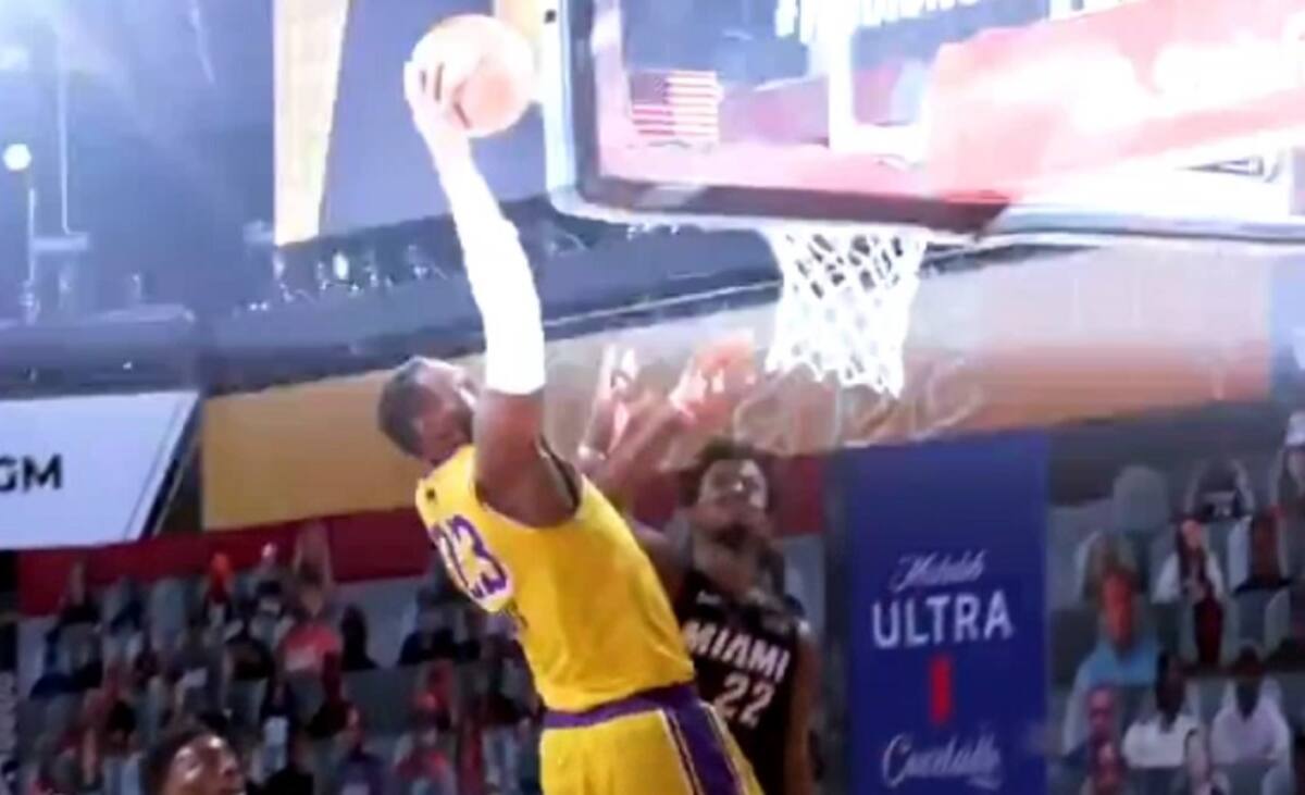 Restando 8 minutos y 47 segundos para el término del segundo en un nuevo partido de las finales de la NBA, LeBron James no perdonó y atacó con todo la zona rival para arremeter con todo su poderío y anotar una notable clavada que, en ese entonces, le dio el 34 a 36 momentáneo a los Lakers frente a los Heat.
