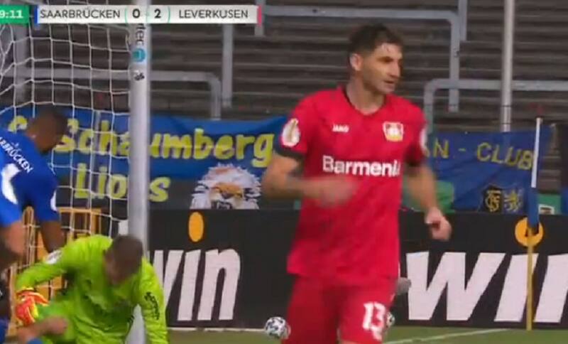 Lucas Alario aprovechó un rebote, tras una buena jugada colectiva del equipo. La descordinación entre el portero y la defensa del Saarbrücken les pasó la cuenta con un tremendo disparo cruzado.