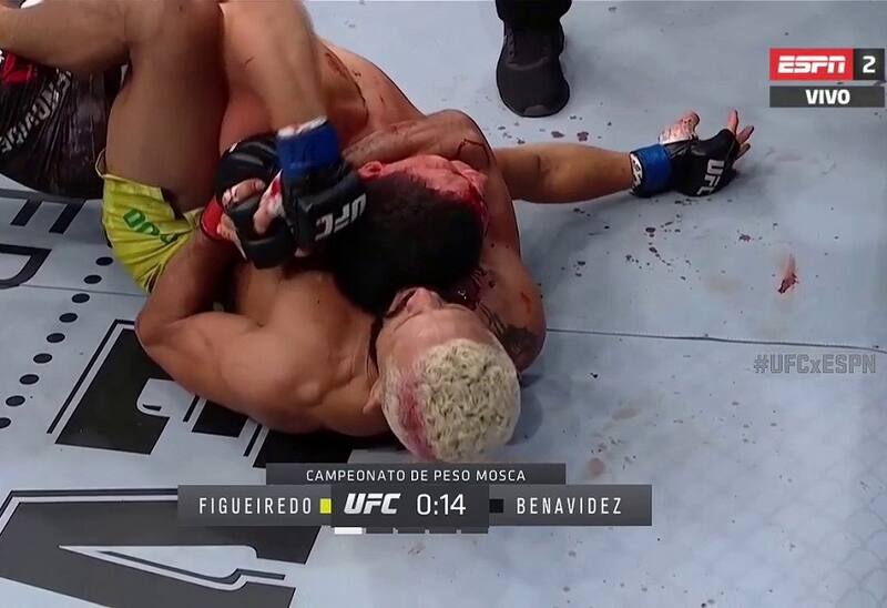 Se cumplía casi el fin del primer round, cuando el brasileño Deiveson Figuereido se fue con todo en busca del cetro de monarca de los pesos mosca en la UFC. Tras dar más de 4 minutos de intenso combate, derribó a su rival aplicánndole una mortal mataleón que terminó con el norteamericano dormido en el octágono.