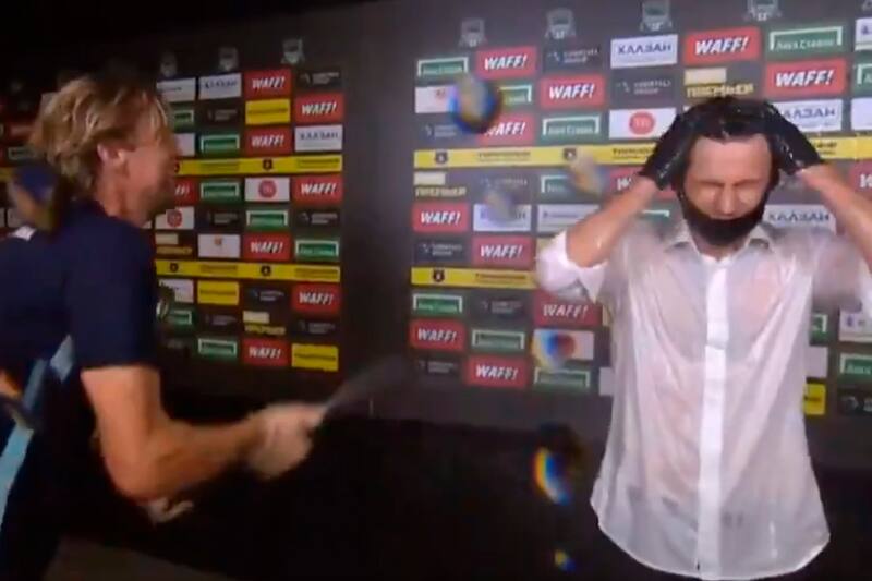 El técnico del Zenit, Serguéi Semak, compadecía ante la prensa luego del triunfo sobre el Krasnodar que significaba el campeonato del equipo de San Petesburgo, cuando llegó uno de sus pupilos para empaparlo de alcohol, generando la simpática reacción del entrenador.