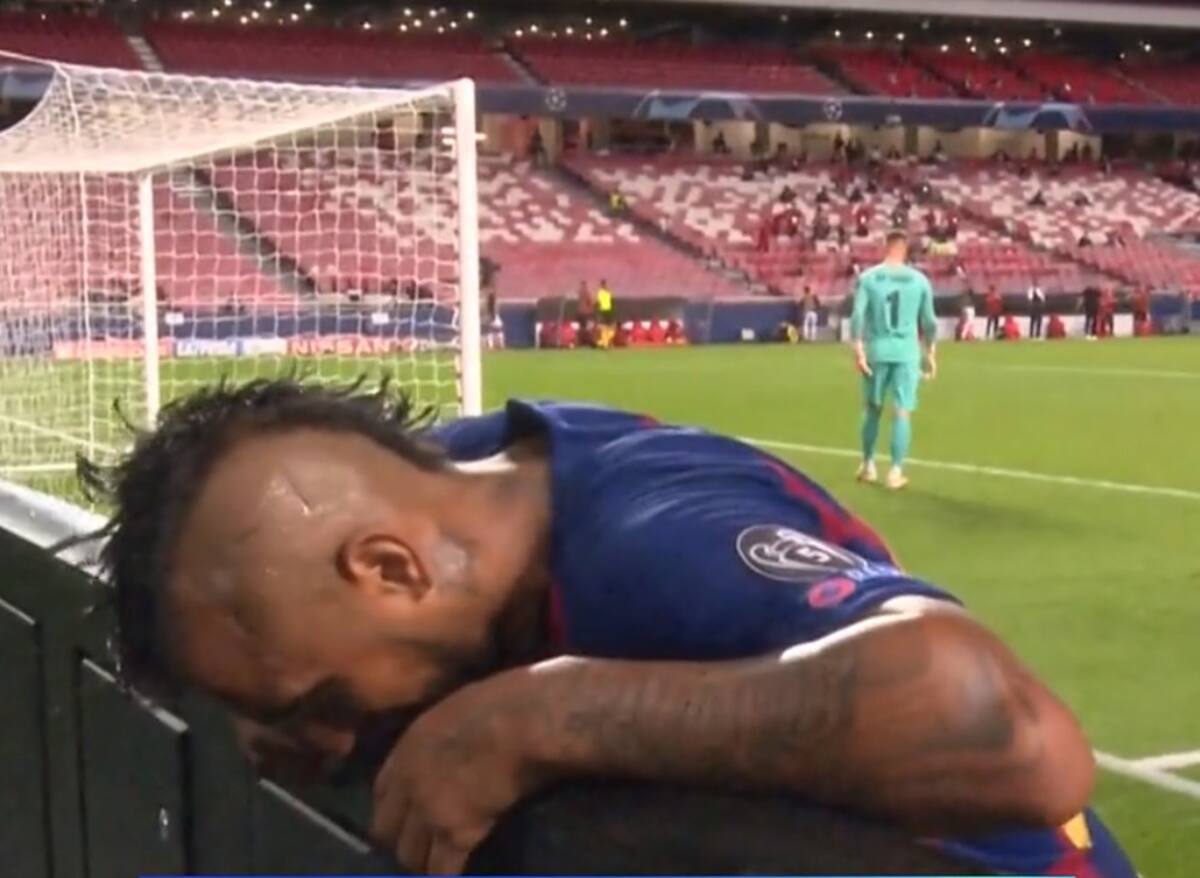 El delantero anotó el sexto tanto de la aplastante victoria de Bayern Munich por 8-2 ante los culés. Tras la conversión del polaco, el mediocampista nacional se llenó de impotencia por la situación que vivía su equipo.