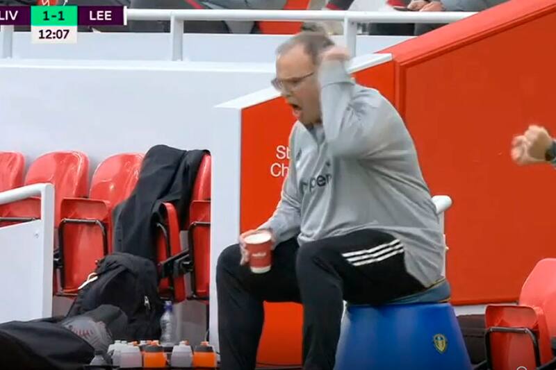 Tras el empate del Leeds tras la gran jugada de Jack Harrison, Marcelo Bielsa celebró eufóricamente el gol de su pupilo en Anfield Road.