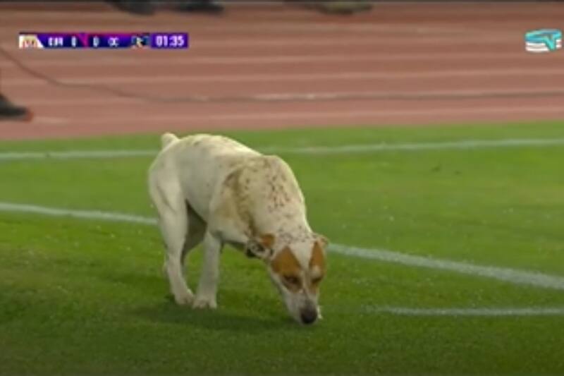 Acto seguido, la mascota corrió hasta uno de los costados del terreno de juego y procedió a orinar, para luego ser llamado por uno de los pasapelotas y abandonar el campo.