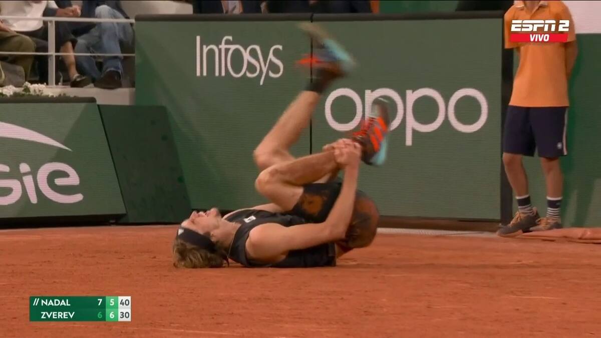 Semifinales de Roland Garros y el partidazo entre Rafael Nadal y Alexander Zverev se vio empañado por una lamentable caída del alemán, que justo cuando le hacía el peso al español se dobló el tobillo y terminó en el piso.